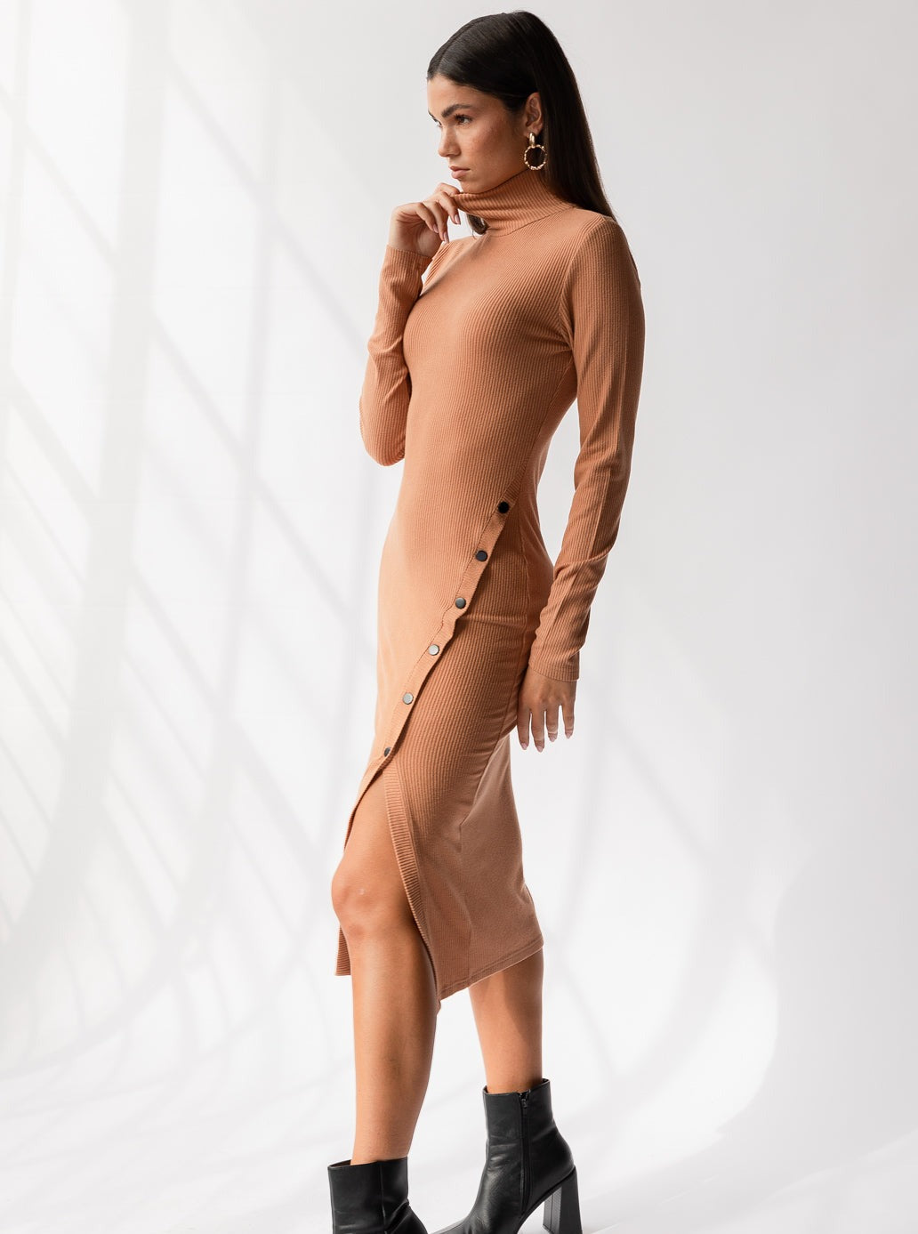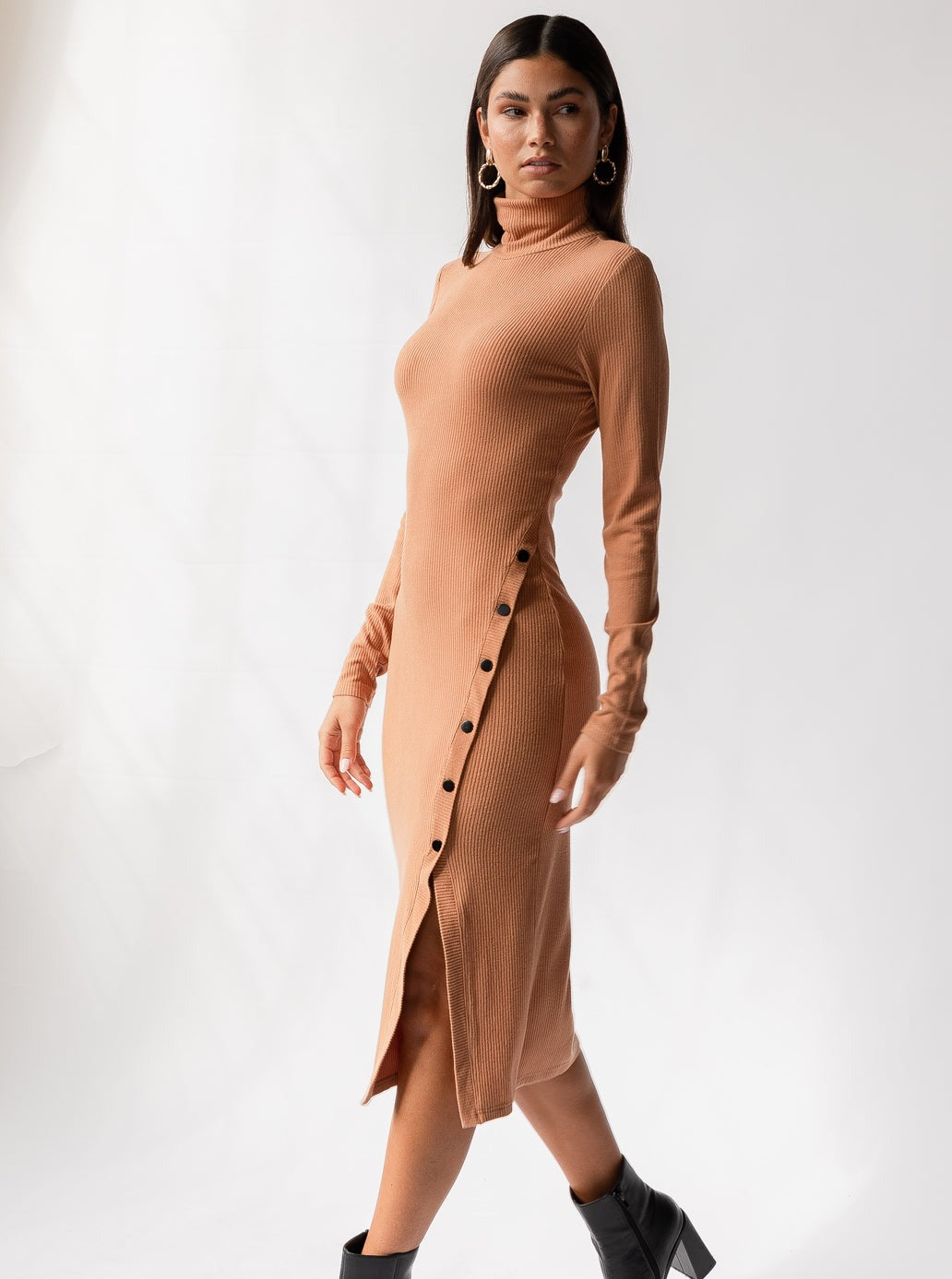 This long sleeve turtleneck dress exudes confidence and class. The dress is a flattering midi length in a camel colored stretch knit fabric. The side button detail adds a stylish touch to a dress you will wear over and over again.