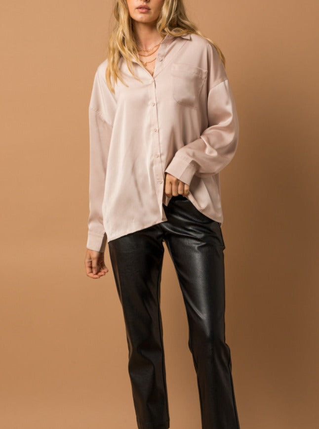 The Oversized Satin Button Up serves as one of the most versatile pieces in your closet. Wear this top with trousers in a professional setting, with jeans for casual, with shorts and a tank in warm weather or with leather pants for a night out with the girls!