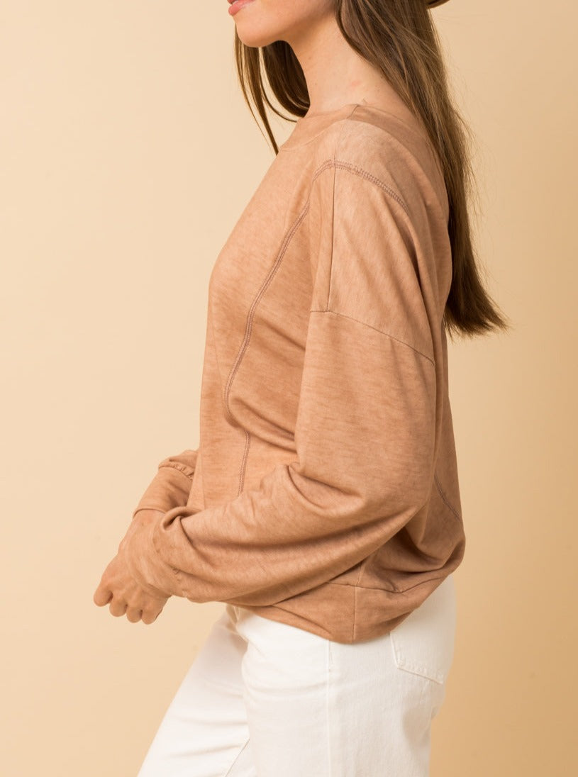 The Pumpkin Spice Top features a crew neckline, relaxed sleeves, and reverse stitching. This comfy, casual top is unique with a gathered open back. Pair with your favorite denim and match the fall foliage!
